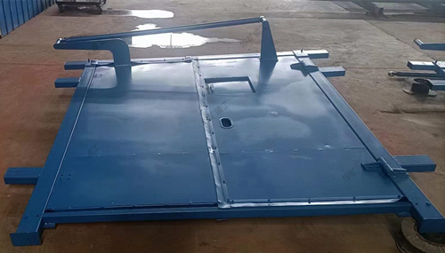 礦用無壓風(fēng)門適用于煤礦井下巷道任何需要安設(shè)風(fēng)門的地點。無壓風(fēng)門采用壓力平衡原理,每道風(fēng)門為雙扇鋼制門框異向同步開閉,運用聯(lián)桿平衡機構(gòu)把作用在風(fēng)門上的壓力通過聯(lián)桿平衡機構(gòu)轉(zhuǎn)化為一種內(nèi)力并得到平衡,保證了風(fēng)門打開時省力、方便靈活。由于壓力平衡式風(fēng)門為異向開閉,因此無論風(fēng)流方向如何,兩扇門均同時受到風(fēng)流的推力和風(fēng)流的壓力,而且大小相等。另外在門框橫梁上的風(fēng)門開啟方向的異側(cè),焊接擋板確保風(fēng)流反向時風(fēng)門不被吹開。同時通過配重塊產(chǎn)生的牽引力實現(xiàn)風(fēng)門自動關(guān)閉。
