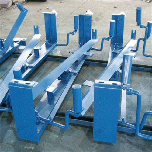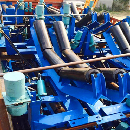 液壓糾偏裝置是由檢驅(qū)輪、油泵、復合油缸、油管、固定支架構(gòu)成。當皮帶運行跑偏時,皮帶和檢驅(qū)輪接觸,檢驅(qū)輪帶動油泵旋轉(zhuǎn),輸出液壓油控制驅(qū)動油缸往復運動,帶動調(diào)心托輥偏轉(zhuǎn),使調(diào)心托輥的線運動方向與皮帶的運動方向形成。