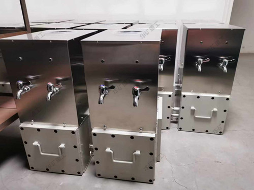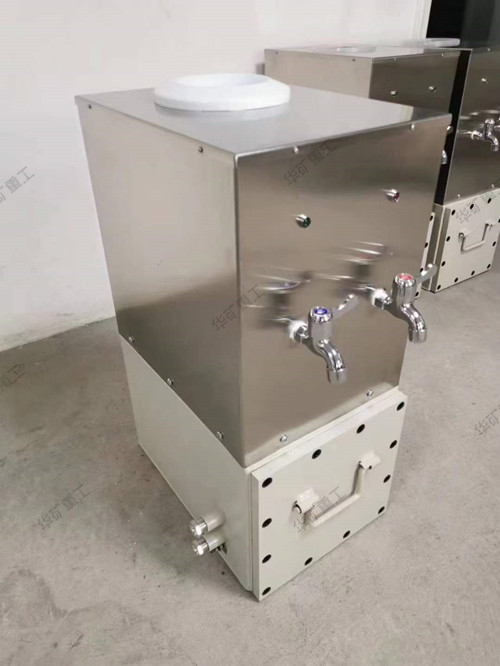 礦用防爆飲水機(jī)為礦用隔爆兼本安型,防爆標(biāo)志為Exd[ib]I。使用在有甲烷氣體混合物和煤塵爆炸危險(xiǎn)的煤礦井下??赏瑫r(shí)提供85℃的熱水和常溫水,可供井下工作人員飲用熱水。本加熱器能自動(dòng)控溫,采用內(nèi)置不銹鋼電加熱管加熱,具有壽命長(zhǎng)熱效高,升溫快,噪聲低,具有安全隔爆,省電等特點(diǎn)。