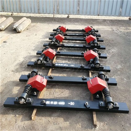 阻車器為了發(fā)揮其作用必須在安裝時將阻車器作為煤礦地面或井下運輸軌道上阻擋600mm、900mm軌距1噸、1.5噸、3噸礦車使用。根據(jù)需要可用兩套單式阻車器并成復式阻車器。