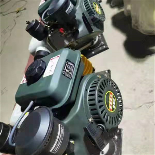 按二沖程內(nèi)燃機(jī)原理制成,汽缸內(nèi)有上、下兩個(gè)活塞,上活塞是內(nèi)燃活塞,下活塞是緩沖活塞。汽缸下部套裝有傾斜底面的夯錘,使汽缸豎向軸線朝前偏斜。上活塞桿從汽缸頂蓋中間的通孔伸出,下活塞桿從汽缸下端面伸出,并與夯錘聯(lián)成一體,汽缸與夯錘之間以彈簧拉緊,并設(shè)有扶手以控制夯土機(jī)的前進(jìn)方向。火力夯在可燃混合氣的燃爆力作用下,因此,朝前上方躍離地面,并在自重作用下,墜落地面夯擊土壤,夯錘一躍一墜,機(jī)身就步步前移。