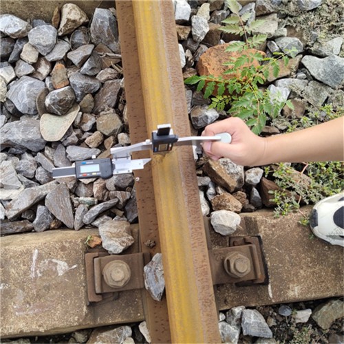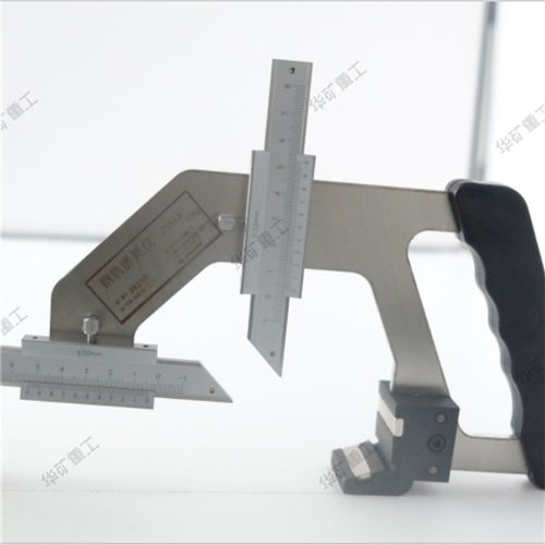 握住手柄,將磨耗尺定位在被測鋼軌的外側(cè)面,推動(dòng)垂磨測尺和側(cè)磨測尺使其測頭分別與鋼軌上表面和內(nèi)側(cè)面接觸,此時(shí)即可從讀數(shù)裝置中讀取鋼軌垂直磨耗和側(cè)面磨耗量。