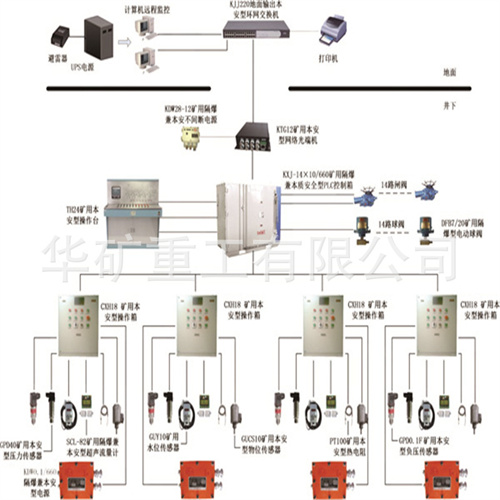 KJ416礦用水泵監(jiān)控系統(tǒng)主要由KXJ14×10/660隔爆兼本安型PLC控制箱、TH24礦用本安型操作臺、CXH18礦用本安型操作箱、監(jiān)控計算機及軟件、打印機、不間斷電源、多協(xié)議網(wǎng)關(guān)、多種傳感器及傳輸設(shè)備組成。