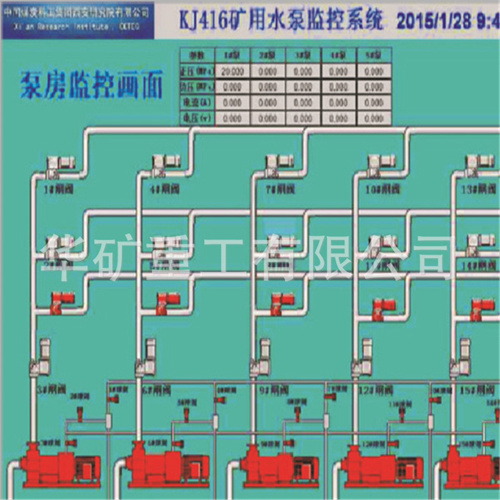 KJ416礦用水泵監(jiān)控系統(tǒng)是一套可對礦井水泵抽排水進行集中監(jiān)控并能實現(xiàn)遠(yuǎn)程實時監(jiān)控的現(xiàn)代化控制系統(tǒng),該系統(tǒng)解決了現(xiàn)有礦井排水系統(tǒng)開泵程序繁瑣,發(fā)生透水事故時無人開啟備用水泵,系統(tǒng)故障以及排水效率低下等問題。本系統(tǒng)通過各種先進可靠的傳感器、保護器、電動閘(球)閥、監(jiān)控電視等監(jiān)測煤礦井下排水系統(tǒng)各設(shè)備的工作狀態(tài),實現(xiàn)井下水位、水壓、水泵排水系統(tǒng)的自動監(jiān)控,及時發(fā)現(xiàn)系統(tǒng)存在的隱患與故障點。此外,將監(jiān)測到的數(shù)據(jù)實時通過光纖上傳至地面上位系統(tǒng)可方便實現(xiàn)井下泵房遠(yuǎn)程控制。該系統(tǒng)與KJ117礦井水文監(jiān)測系統(tǒng)的聯(lián)動,可以實時監(jiān)控礦井上下水文觀測孔水壓、水溫、流量以及采空區(qū)水位,排水明渠等水文參數(shù),通過多種傳感器的實時監(jiān)測可實現(xiàn)對煤礦透水事故的預(yù)警,事故通過井下光纜將數(shù)據(jù)傳輸至生產(chǎn)調(diào)度中心監(jiān)控平臺,系統(tǒng)預(yù)留井下通訊接口,并以指揮井下人員在發(fā)生透水事故時的緊急撤離,為及時啟動礦井水災(zāi)應(yīng)急救援和最大限度地保證煤礦安全生產(chǎn)提供可靠技術(shù)手段。