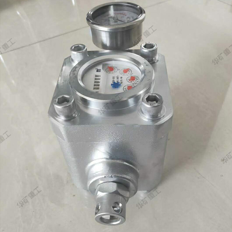 高壓注水流量計安裝在注水系統(tǒng)管路中.水流入水表后,在濾罩沿葉輪盒下腔切線進(jìn)入葉輪盒,推動葉輪旋轉(zhuǎn);水在葉輪盒中旋轉(zhuǎn)上升進(jìn)入葉輪盒上腔切線流出;葉輪旋轉(zhuǎn)經(jīng)其上面的永磁體帶動承壓板上面的中心輪轉(zhuǎn)動,中心輪帶動水量指示器中的計數(shù)機(jī)構(gòu)記錄流經(jīng)水表的水量,煤層注水的壓力直接側(cè)壓孔,通過壓力指示器指示